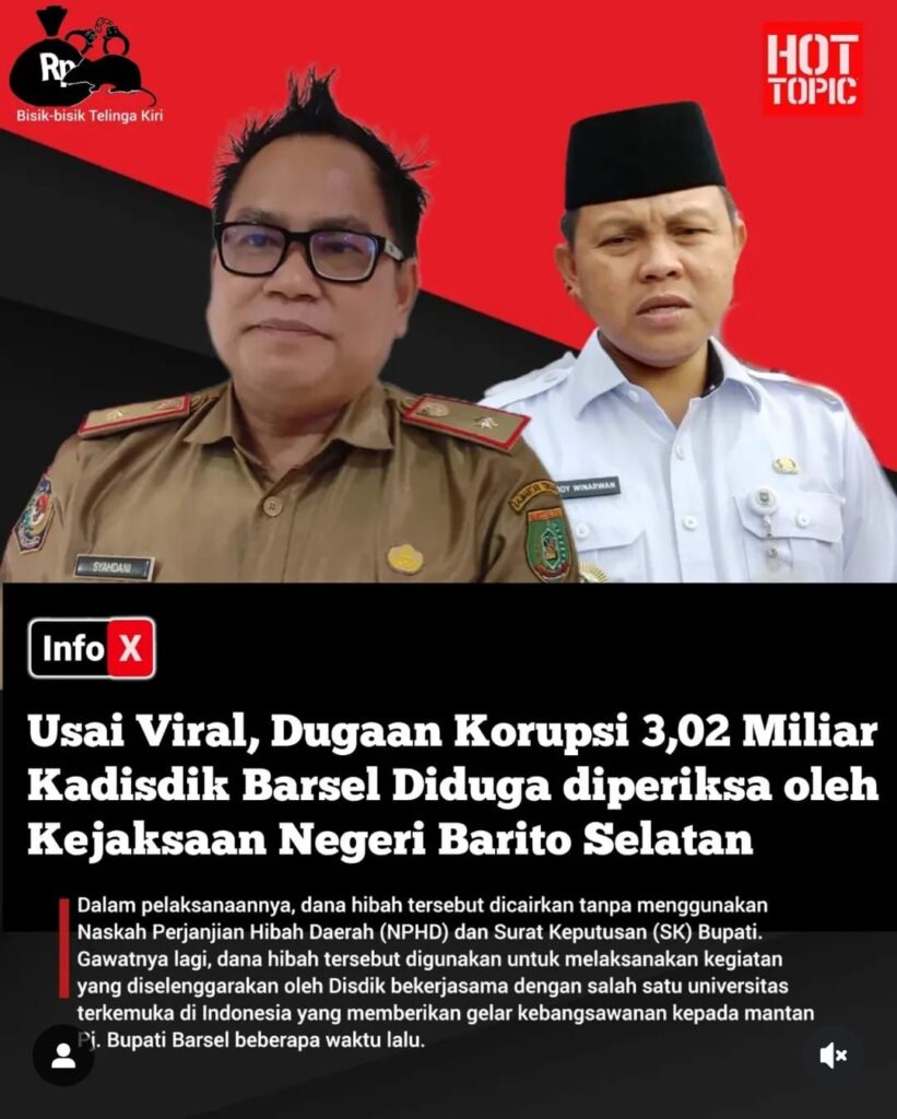 Buntok BarselOne,-Beredar informasi di Instagram tentang dugaan korupsi 3,02 miliar di Dinas Pendidikan Barito Selatan, Kalimantan Tengah. Dana hibah tersebut dicairkan tanpa menggunakan Naskah Perjanjian Hibah Daerah (NPHD) dan Surat Keputusan (SK) Bupati Barito Selatan 2024.