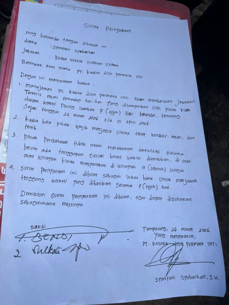Dalam aksi demonstrasi yang tegang dan memanas namun tidak sampai terjadi keributan hingga dilakukan dialog yang di mediasi IPTU Panus yang di dampingi Kompol Tomi Waka Polres Barito Selatan dibuatlah surat pernyataan dari pihak PT. KNPI yang ditandatangani oleh kuasa hukumnya Syahfany Syabran SH disaksikan Sulkali dari Pihak penghubung PT.Kadira Nusa Pertama Inti dan Beben yang di percayakan selaku Penyabung Aspirasi Masyarakat,dengan diberikan waktu selama 1 minggu untuk menjawab tuntutan masyarakat. Jika pihak perusahaan tidak memenuhi tuntutan, Beben meminta agar PT. KNPI angkat kaki dari tanah atau lahan mereka.